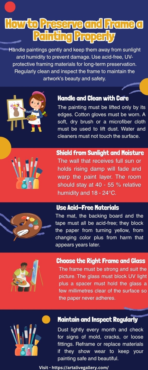 The painting needs a wall that never receives direct sun. The air around it must stay dry and hold a steady temperature. Acid-free board backs the canvas plus glass that blocks ultraviolet light covers the front. A frame holds both layers - its wood or metal must fit the picture's size and weight. Spacers keep the paint surface a few millimetres from the glass so no colour sticks but also no smudge forms. Visit - https://artalivegallery.com/. [more]