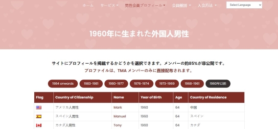 サイトにプロフィールを掲載するかどうかを選択できます。メンバーの約85%が非公開です。 プロファイルは、TMA メンバーのみに直接配布されます。 https://www.marriage-agency.net/men-seeking-women/1960-and-before.php. [more]