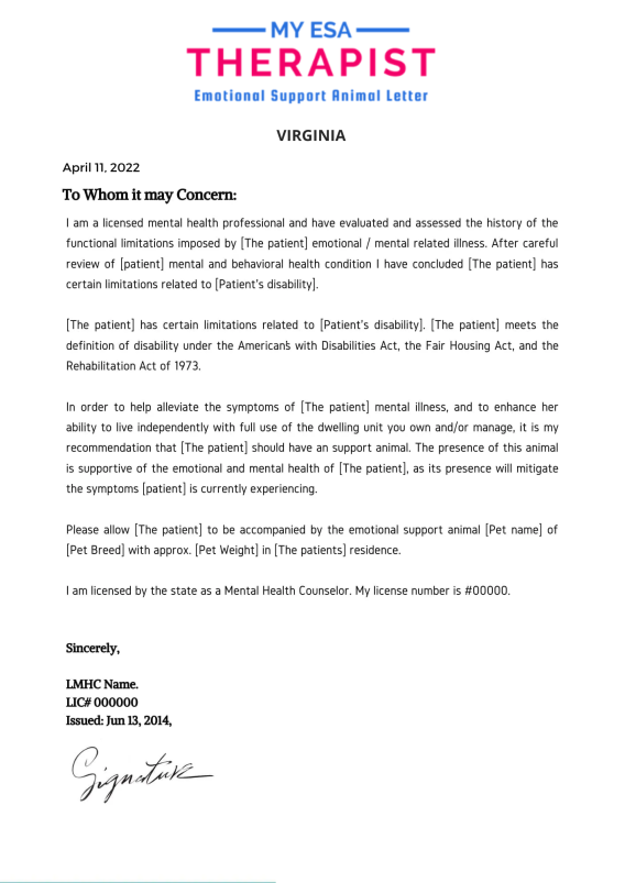 HOW TO GET AN ESA LETTER IN ILLINOIS STATE? Getting an ESA letter with the help of My ESA Therapist in not a challenge. You simply need to follow three simple steps. Apply the evaluation form, fill out all the necessary details about you and your health condition. Submit the form. The doctor will mail you your esa letter. Visit https://myesatherapist.com/illinois/. [more]