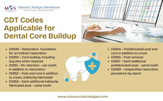 Dental Core Buildup is a restorative procedure where the absent portion of tooth is covered with special dental filling in order to support a dental crown. https://www.outsourcestrategies.com/blog/dental-core-build-up-handling-reimbursement-challenges/. [more]
