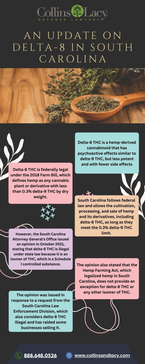 Get the latest insights on the legality and regulations surrounding Delta-8 products in the state. Stay updated on the legal status and regulations surrounding Delta-8 in the state. Your guide to understanding the current landscape of Delta-8 in South Carolina. Explore the latest updates on our website! https://www.collinsandlacy.com/an-update-on-delta-8-in-columbia-sc/. [more]
