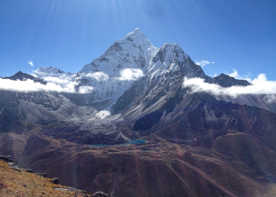 Beautiful view of Mt.Ama Dablam from Nangkartshang Hill. You hike to this peak from Dingboche on the second altitude practice hike during the Everest base camp trek, Everest high passes trek, Everest base camp helicopter return trek, and 'Everest base camp and Gokyo Lakes trek' before visiting the Gokyo Lakes going through Cho La pass. you can also explore this beauty on a helicopter from Kathmandu taking a helicopter tour to the Everest base. [more]