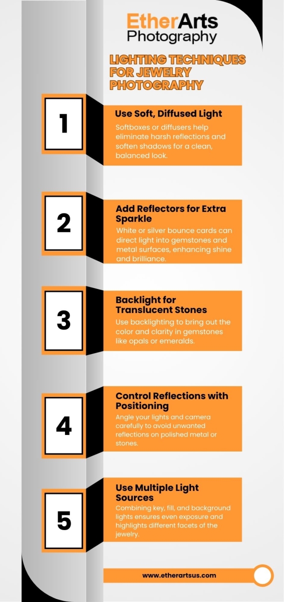 This infographic shares five proven lighting tips to enhance your jewelry photos. From minimizing glare to maximizing sparkle, each technique helps create clean, professional visuals for e-commerce or editorial use. https://pin.it/S71khoGgw. [more]