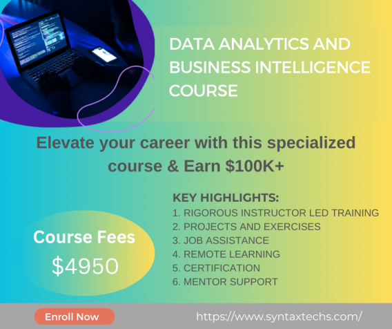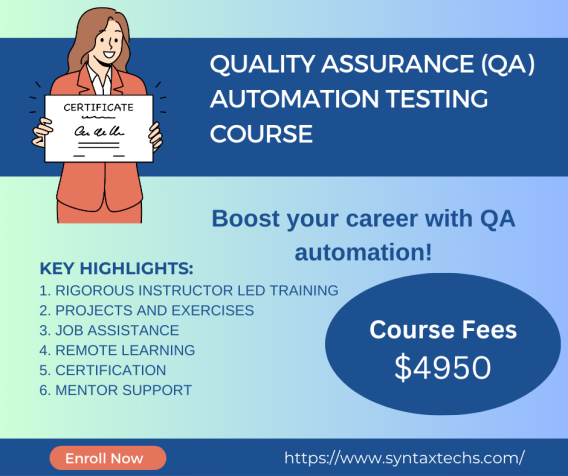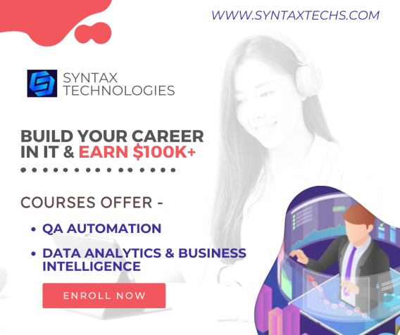 Ready to launch your IT career? QA Automation & Data Analytics Courses offered by Syntax Technologies pave the way to a $100K+ salary. Dive into cutting-edge skills, unlock lucrative opportunities, and propel your career to new heights. - Gain hands-on experience with industry-leading tools and techniques. - Dive deep into data analytics and automation strategies. - Unlock lucrative opportunities in high-demand tech fields. - Secure a rewarding career with a. [more]