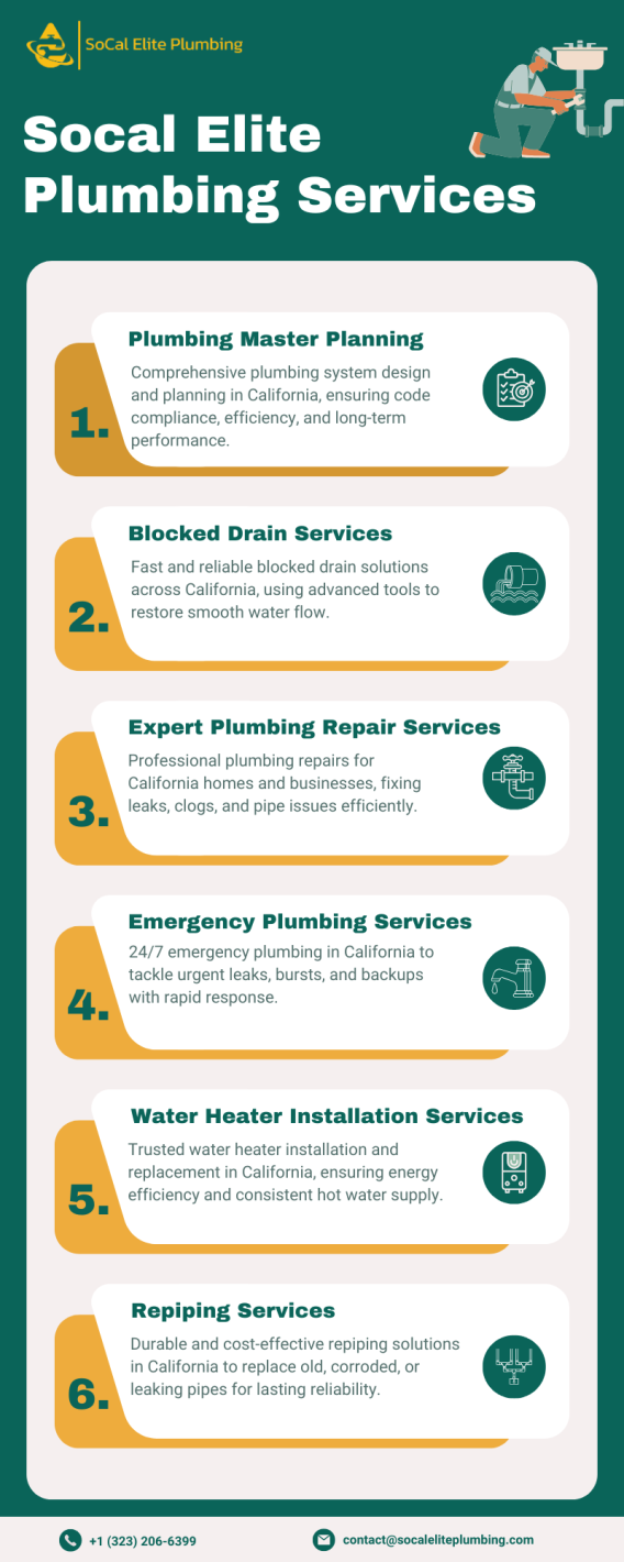 Top Plumbing Services in California | SoCal Elite Plumbing Experts SoCal Elite Plumbing provides top-rated plumbing services across California, including plumbing master planning, blocked drain repairs, emergency plumbing, water heater installation, and repiping. Trust our experts for reliable, fast, and affordable plumbing solutions. Read More:- http://bit.ly/4hvBMtM. [more]