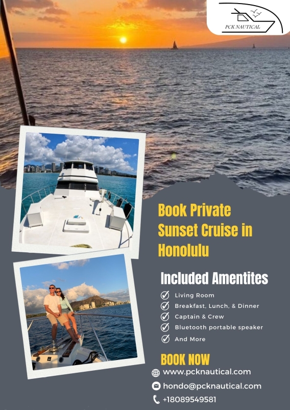 PCK Nautical: Your Exclusive Gateway to a Private Sunset Cruise in Honolulu Experience the outstanding beauty of Honolulu's coastline with our PCK Nautical Private Sunset Cruise. Our premium offering takes you on a magical journey along the Pacific Ocean, where you can experience the serene waves and the magnificent red-orange hues of sunset. With premium catering and top-of-the-line amenities, we offer an unforgettable soirée under the fading twilight. Absolutely perfect for honeymooners, vacationing families, or anyone looking to experience the tropical charm of Honolulu in an extraordinary way. For more details, visit our website: https://www.pcknautical.com/sunrise-sunset-cruises