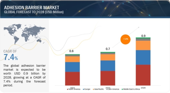 Global Adhesion Barrier Market Worth $0.9 Billion by 2028: Key Insights and Analysis https://www.marketsandmarkets.com/Market-Reports/adhesion-barrier-market-208132543.html The global adhesion barrier market size is projected to reach USD 0.9 billion by 2028 from USD 0.7 billion in 2023, at a CAGR of 7.4%. The main drivers driving the growth of this market are the increasing amount of surgeries and sports-related injuries, a growing elderly population, and increasing understanding of adhesion formation and conditions associated with adhesions. During the forecast period, this market's growth is anticipated to be constrained by surgeons' resistance to using adhesion barriers. Download a PDF Brochure: https://www.marketsandmarkets.com/pdfdownloadNew.asp?id=208132543 Based on products, the adhesion barriers market is further segmented into synthetic and natural adhesion barriers. In 2022, the synthetic adhesion barriers segment accounted for the largest share of the adhesion barriers market. The large number of synthetic adhesion barriers that are commercially available and their higher utilisation by surgeons in various surgical procedures as compared to natural adhesion barriers can be attributed to the segment's growth. The sub-segment of synthetic adhesion barriers includes hyaluronic acid, regenerated cellulose, polyethylene glycol, and other synthetic adhesion barriers. Because they are biocompatible and bioresorbable, hyaluronic acid-based adhesion barriers have the largest market share in the synthetic adhesion barrier market. These are frequently used for open and laparoscopic general surgeries, including those involving the abdomen, pelvis, gynaecology, and other surgeries. Based on the type of formulation, the adhesion barriers market is segmented into film formulations, gel formulations, and liquid formulations. Given surgeon's increased preference for adhesion barriers in the form of films as well as the availability of clinical safety and efficacy data for these formulations, film formulations dominated the adhesion barrier market in 2022. Based on applications, General/Abdominal Surgeries surgeries held the largest share of the adhesion barriers market in 2022. A number of factors, including the increased risk of post-surgical adhesion formation in general/abdominal surgeries, the rising number of general/abdominal surgeries, and the availability of several commercialized adhesion barrier products for general/abdominal surgeries, can be attributed to the general/abdominal surgeries segment the large share of this market Based on end user, hospitals and clinics held the largest share of the adhesion barriers market in 2022. The largest share of this segment in the market of adhesion barrier is attributed to the large number of surgeries happening in the hospitals and clinics in both developed and developing countries. Geographically, the adhesion barriers market is segmented into North America, Europe, Asia Pacific, Latin America, and The Middle East and Africa. The North America's strong healthcare system, higher public and private expenditures on health care, growing numbers of the geriatric population, and an increasing prevalence of chronic and lifestyle diseases all contributed to North America having the largest share of the adhesion barrier market. On the other hand, the APAC market for adhesion barrier will expand due to factors like the rapidly growing geriatric population, the epidemiological shift from infectious to chronic diseases, and the rise in medical tourism. As a result, the APAC is anticipated to grow at a higher CAGR than other regions during the forecast period.