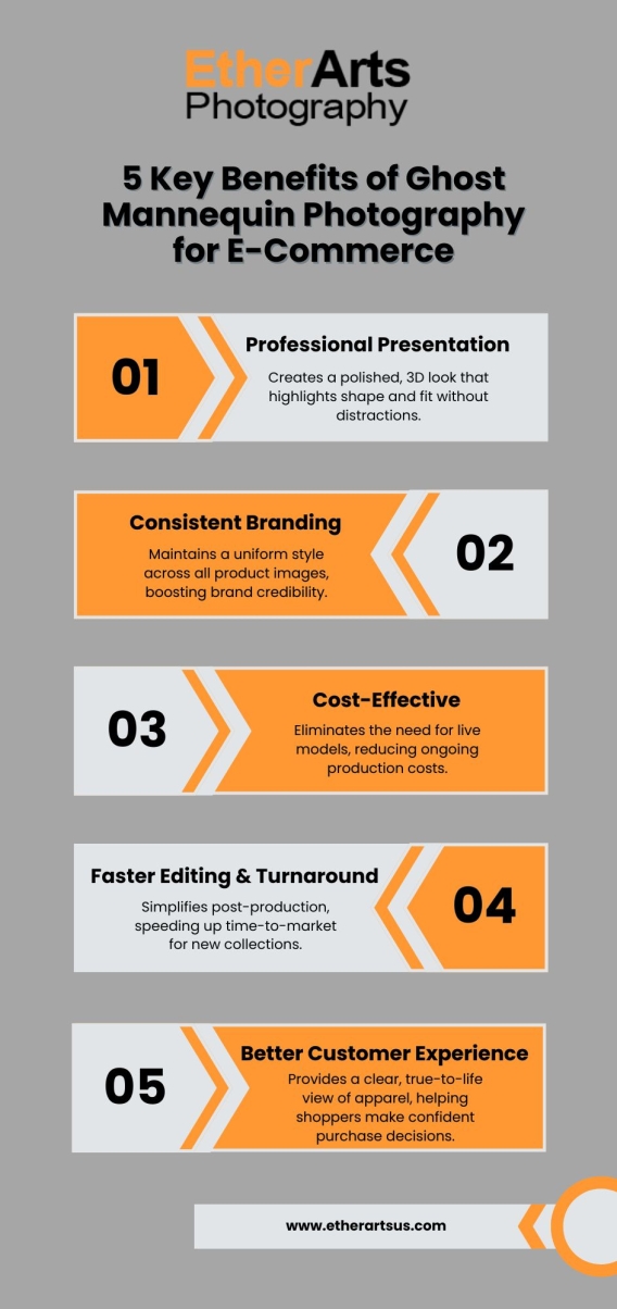 This infographic highlights five major advantages of ghost mannequin photography for e-commerce businesses, including professional presentation, consistent branding, cost efficiency, faster turnaround, and improved customer confidence. https://www.etherartsus.com/ghost-mannequin-photography.html
