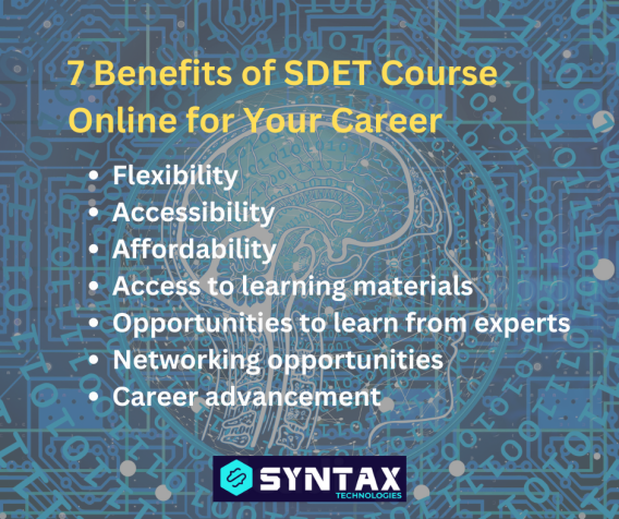 Looking to boost your career in software development? Consider taking an SDET course online! SDET (Software Development Engineer in Test) is a crucial role in any tech company, and having the right skills can make you stand out from the crowd. By taking an SDET course online, you can gain the knowledge and practical experience you need to excel in this field. Here are some of the benefits of an SDET course online for your career: 1- Learn the latest industry tools and techniques 2- Gain hands-on experience with testing frameworks and automation 3- Expand your knowledge of software development and testing processes 4- Improve your problem-solving and analytical skills 5- Boost your resume and increase your chances of landing a high-paying job Don't let your career stagnate - take your skills to the next level with an SDET course online! Get free enrollment at https://www.syntaxtechs.com/courses/sdet-training-course-online #sdet #benefits #onlinecourse #careergrowth #careergoals #softwaredevelopment #softwaretesting #softwareengineer
