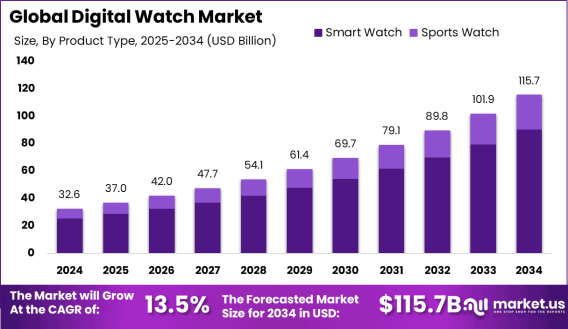 Digital Watch Market size is expected to be worth around USD 115.7 Billion The Global Digital Watch Market size is expected to be worth around USD 115.7 Billion By 2034, from USD 32.6 billion in 2024, growing at a CAGR of 13.5% during the forecast period from 2025 to 2034. In 2024, North America held a dominant market position, capturing more than a 36% share, holding USD 11.7 Billion revenue. Read more - https://market.us/report/digital-watch-market/ A digital watch is a timekeeping device that displays time using digits on an electronic screen, typically LCD or LED, instead of traditional analog hands. The digital watch market refers to the global industry involved in the production, distribution, and sale of these devices. This market includes a wide range of products, from basic timekeeping watches to advanced smartwatches with features like fitness tracking, heart rate monitoring, and smartphone connectivity. It’s a dynamic space driven by consumer demand for functionality and style, with major players like Apple, Samsung, and Garmin leading the charge. The market caters to diverse groups, including fitness enthusiasts, tech-savvy users, and those seeking affordable, multifunctional devices. Its growth is fueled by rapid technological advancements and a shift toward health-conscious lifestyles, making it a vibrant and evolving sector. The term “Digital Watch Market Market” seems to be a repetitive phrasing, likely referring to the same digital watch market but possibly emphasizing its ecosystem or a specific segment within it. For clarity, I’ll interpret it as the broader market environment, including supply chains, distribution channels, and consumer trends that shape the digital watch industry. This ecosystem encompasses manufacturers, retailers, and technology providers working together to meet growing demand. It’s influenced by e-commerce growth, which makes watches more accessible, and the integration of digital watches with other devices like smartphones. The market thrives on innovation, with brands competing to offer cutting-edge features while balancing affordability and style to appeal to a wide audience.