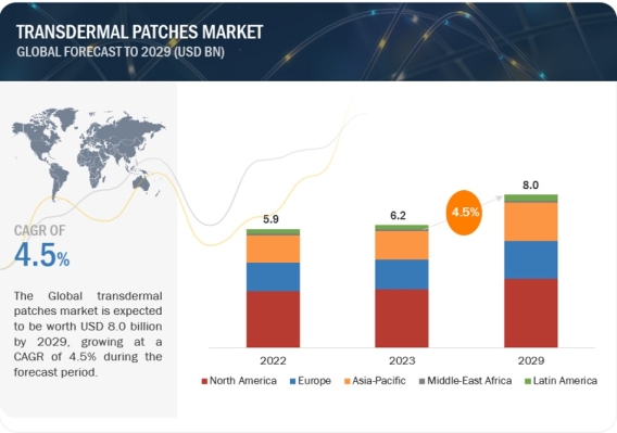 Innovations and Opportunities in the $8.0 Billion Transdermal Patches Market by 2029 https://www.marketsandmarkets.com/Market-Reports/transdermal-patches-market-190809043.html The global transdermal patches market is projected to reach 8.0 USD Billion by 2029 from USD 6.2 Billion in 2023, at a CAGR of 4.5% from 2023 to 2029. The global market for transdermal patches is expanding as a result of a number of causes, including the rising incidence of chronic illnesses, the expanding use of analgesic patches, technological developments in transdermal patches, and the shift from traditional injections to transdermal patches. However, over the anticipated period, obstacles such as medication failure, transdermal drug delivery system recalls, and the escalating expense of healthcare facilities would probably limit market expansion to some extent. Download a PDF Brochure: https://www.marketsandmarkets.com/pdfdownloadNew.asp?id=190809043 A transdermal patch is a medicated adhesive patch that delivers medication through the skin into the bloodstream. Transdermal patches are a convenient and effective way to deliver medication, as they can provide a steady and controlled release of medication over time. On the basis of patch type, the transdermal patches market is segmented into Drug-In-Adhesive, Matrix Patches, Reservoir Membrane Patches, Microneedle Patches, Iontophoresis Patches, and Vapour Patches. In 2022, the Drug-In-Adhesive segment accounted for the largest share of the transdermal patches market. The drug-in-adhesive patch market is expected to continue to grow in the coming years. This is due to the increasing prevalence of chronic diseases, the growing popularity of non-invasive drug delivery methods, and the development of new and innovative drug-in-adhesive patches. Based on adhesive type, the transdermal patches market is segmented into Acrylic Adhesives, Silicone Adhesives, Hydrogel Adhesives and Other Adhesives. In 2022, the Acrylic Adhesives segment accounted for the largest share of the transdermal patches market. The transdermal patch market is dominated by acrylic adhesive patches because of its many advantages over other kinds of adhesives. Acrylic adhesives possess strength, biocompatibility, permeability, flexibility, resistance to water, and affordability. These characteristics make them ideal for use in transdermal patches, where they may firmly stick to the skin and efficiently provide medication over an extended period of time. Based on Application, the transdermal patches market is segmented into Pain Management, Smoking Cessation, Hormone Replacement Therapy, Cardiovascular Disorder, Central Nervous System Disorder and Others. The pain management patch claims the largest segment in the transdermal patch market due to its efficacy, convenience, and patient-friendly application. These patches provide a controlled release of pain-relieving medications directly through the skin into the bloodstream, offering a consistent and prolonged effect. The ease of use and non-invasive nature of transdermal patches make them particularly appealing for individuals seeking a discreet and hassle-free method of pain management. Based on End Users, the transdermal patches market is segmented into Homecare Settings and Hospitals And Clinics. The Homecare Settings segment is estimated to grow at the highest CAGR during the forecast period. Home care settings eliminate the need for patients to travel to healthcare facilities, thus saving time and money. Owing to this convenience and better affordability, an increasing number of patients are opting for home-based treatments. Also, for patients requiring long-term therapy, inpatient care is not only extremely expensive but also prevents patients from resuming a normal lifestyle and work activities. Geographically, North America is the largest regional market for transdermal patches market in 2022, followed by Europe. Due to a number of reasons that together account for a considerable portion of its market share, North America leads the largest section of the transdermal patch market. The region's strong pharmaceutical regulatory framework, high incidence of chronic illnesses, and sophisticated healthcare infrastructure all contribute significantly to the transdermal patch's extensive use. The need for these patches to treat chronic ailments including pain, hormone imbalances, and cardiovascular diseases has grown as a result of the aging population and greater awareness of non-invasive medication delivery techniques. The prominent players in the global transdermal patches market are Nitto Denko Corporation (Japan), Hisamatsu Pharmaceuticals Co. Ltd. (Japan), Novartis AG (Switzerland), USB S.A. (Belgium), Boehringer Ingelheim International GmbH (Germany), Johnson & Johnson (U.S.), Viatris Inc. (U.S.), Endo International plc. (Ireland), Alvogen Group Inc. (U.S.), Sparsha Pharma International Pvt Ltd (India), Iontopatch (U.S.), Medherant Limited (U.K.), Luye Pharma Group (China), AbbVie Inc. (U.S.), Cipla Inc. (India), Teva Pharmaceutical Industries Ltd. (Israel), Agile Therapeutics (U.S.), Bayer AG (Germany), Amneal Pharmaceuticals LLC. (U.S.), Hikma Pharmaceuticals PLC (U.K.), AdhexPharma (France), Evernow (U.S.), LEAD CHEMICAL Co., Ltd. (Japan), Purdue Pharma L.P (U.S.) and Mundipharma International (U.K.) Recent Developments of Transdermal Patches Industry In July 2023, Industria Macchine Automatiche S.P.A. (Italy) acquired Phoenix Italia S.r.l. (Milano). IMA completed the acquisition of 60% of Phoenix Italia S.r.l. and 100% of its subsidiary Phoenix Tech S.r.l., both companies based in Bareggio (Milano), from its sole shareholder Phoenix Group Holding S.r.l. In July 2023, IMA completed the purchase of 70% of Mespic S.r.l. and 100% of its Illinois-based subsidiary, Mespic North America Corporation, from its sole shareholder, Holding FGLG S.r.l.. In August 2022, SEA Vision Group and Marchesini Group launched the following solutions: the INTEGRA 