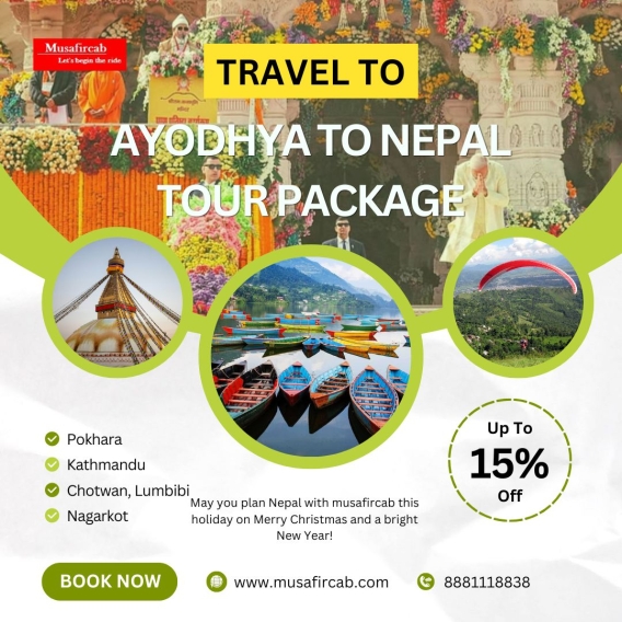 https://www.musafircab.com/page/ayodhya-to-nepal-tour-package Celebrate Christmas and New Year with a memorable journey from Ayodhya place of the birthplace of Lord Rama, to the breathtaking landscapes of Nepal with Musafircab. Our exclusive New Year Ayodhya to Nepal Tour Package, Nepal Tour Package from Ayodhya offers a perfect blend of spirituality, natural beauty, and cultural exploration, making it an ideal way to welcome the New Year. This tour covers destinations like Lumbini, Pokhara, Kathmandu, and Nagarkot, providing travellers with a seamless and memorable experience. This package includes comfortable accommodations, delicious meals, a private cab service, and a tour guide, ensuring a hassle-free. We offer fully customizable itineraries, allowing you to tailor the trip to your preferences for a truly personalized experience. For a smooth and enjoyable journey book your Ayodhya to Nepal tour packages or cab service with Musafircab at +91–8881118838 or email info@musafircab.com. Our dedicated team is here to ensure your journey becomes a beautiful memory.
