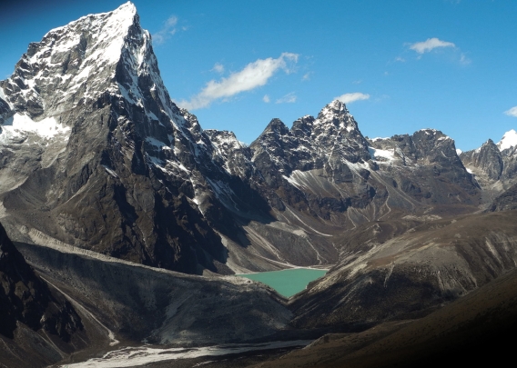 You can see this magnificent view of the Everest Region from Nangkartshang Hill while hiking for altitude practice from Dingboche during the Everest Base Camp Trek, Everest High Passes Trek, and Everest Base Camp Helicopter Return Trek. You walk very close to this mountain and lake while you are walking towards Cho La Pass to go to Gokyo Lakes during the 'Everest Base Camp and Gokyo Lakes Trek' and Everest High Passes Trek before going over the Renjo La Pass. The helicopter land near this mountain during the Everest Base Camp Helicopter Tour to change shuttles.
