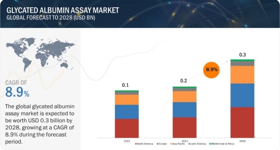 The global glycated albumin assay market is projected to reach USD 0.3 billion by 2028 from USD 0.2 billion in 2023, at a CAGR of 8.9% during the forecast period. The increased number of diabetes cases is the major factor driving the glycated albumin assay market’s growth.