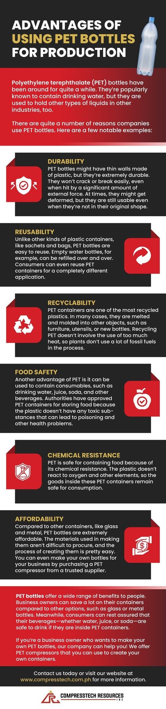 PET bottles have been around for quite a while and they're popularly known to contain drinking water. If you're a business owner that wants to make your own PET bottles, our company can help you! Visit our website at https://www.compresstech.com.ph/ for more information.