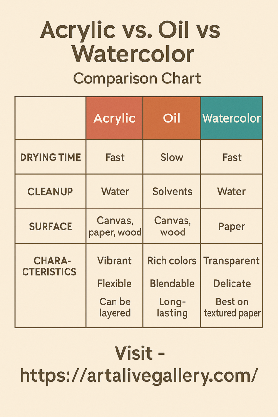 Acrylic paint oil paint as well as watercolor paint give different surface feels and outcomes. Acrylic dries in a fast manner and is good for current, daring styles. Oil paints mix in a smooth manner for finishes that are detailed plus full. They do take more time to dry. Watercolors are light, flowing next to suit artworks that are see-through and fine. At ArtAlive Gallery you find all styles. Every stroke with a brush shows something.Visit - https://artalivegallery.com/
