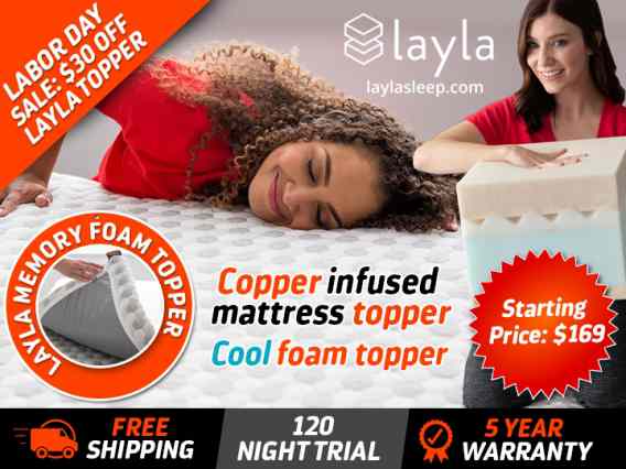 Labor Day Sale!! Get $30 Off on Layla Topper You will get a lot of benefits with our Layla Memory Foam Mattress Topper. Our cooling mattress topper is cooler than cool. Copper gel beads in the foam absorb your body heat and pull it away from you. 5 YEAR WARRANTY! Shop Now!! https://laylasleep.com/product/layla-topper/