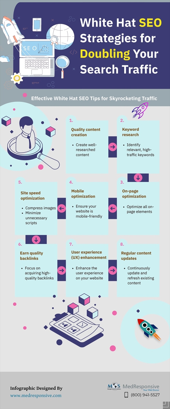 Check out some ethical and effective white hat SEO strategies to improve your website's visibility in search engine results pages. https://www.medresponsive.com/blog/white-hat-seo-strategies-doubling-search-traffic/