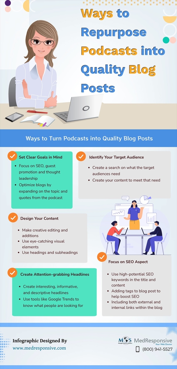 By repurposing podcasts into quality blog posts, businesses can achieve the goal of consistently providing engaging content to the audience. https://www.medresponsive.com/blog/ways-to-repurpose-podcasts-into-quality-blog-posts/