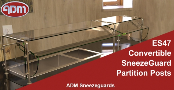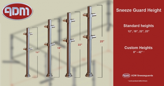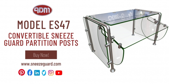 Model Ring-EP5 Sneeze Guard Requirements | ADM ADM Sneezeguards has been manufacturing sneeze guards for over 33 years located in Antioch California. Sneeze Guard Requirements Model Features • Multiple configurations • Operator friendly • Available with LED lights and food warmers • Ring adjustable brackets (Patented) • Custom angle post • Pivoting adjustable brackets • Bracket accepts 1/4’’ or 3/8’ material Visit:Model ES47 Convertible Sneeze Guard Partition Posts | ADM Sneeze Guards are clear tempered glass with round corners, and the posts are made with 304 stainless steel. It is one double-sided post model. These convertible sneeze guard partition posts convert to self-serve sneeze guards from pass-over sneeze guards easily. The Convertible model is available in multi bays options. It has pivoting adjustable brackets.Model EP950 Acrylic Sneeze Guard for Counter Top | ADM EP950-ACRYLIC model features a 1/4'' folded clear acrylic panel with polished edges and radiused corners, posts are made with 304 stainless steel. This acrylic sneeze guard is easy to create more physical distance between your guests who came to visit you. It has a hole on the ground side for exchanging any documents with safe mode.