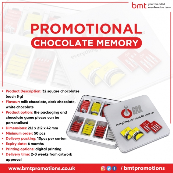 On high quality ivory FSC certified paper, we provide finely constructed features in our simple and stylish weekly notes or daily style. With a variety of branding possibilities available, ivory diaries are the ideal versatile branding platform to boost your company or products, resulting in a fantastic contemporary promotional gift.Black, blue, red, and green refills are included in this fun push-button ballpen. A 360° full colour wrap can be printed on the white portion of the barrel, with spot colour printing also possible. https://bmtpromotions.co.uk/product/quad-ballpen/Our Desk-Mate collection is the ideal way to get your message noticed and establish a prominent spot on your clients' workstations! Calendars, weekly planners, to-do lists, as well as your brand logo and contact information, are all included in the promotional pads. A regular backboard is pasted to 50 sheets of white 80gsm paper. https://bmtpromotions.co.uk/product/a5-wiro-bound-notepad/We have a wide selection of promotional Carnival Colouring Pencils Half Size 6 Pack set for you to choose from at a low price. Rainbow and White are the colours that are available. https://bmtpromotions.co.uk/product/carnival-colouring-pencils-half-size-6-pack/Belluno Economy Oval Key Fob is made of soft touch Belluno PU and has a genuine leather appearance and feel. Belluno comes in a variety of 22 colours, each of which changes colour when embossed, letting your branding stand out even in small details. https://bmtpromotions.co.uk/product/oval-key-fob/Find GD70 Gildan Ladies DryBlend® Double Piqué Polo Shirt with Two self colour button placket at reasonable prices from bmt promotions. https://bmtpromotions.co.uk/product/gd70-gildan-ladies-dryblend-double-pique-polo-shirt/bmt promotions offers a Promotional Envelope with 6 Chocolates (5g) Printed with Your Logo in the UK at a reasonable price. Place your order right now! https://bmtpromotions.co.uk/product/envelope-with-6-chocolates-5g/Get the best deal on Chocolate Memory in UK at bmt Promotions. We have a tasty and exciting range of promotional chocolate products for sale at Outstanding Branding. Shop now. https://bmtpromotions.co.uk/product/chocolate-memory/Chocolate Book can be customised with your logo and produced in the UK at the most competitive pricing. You can send all of your wishes to your loved ones as chocolates with your personalised message printed on them, or you can even print invitations for important occasions on chocolates instead of cards. https://bmtpromotions.co.uk/product/chocolate-book/Find Promotional Maxi Premium Sweets print with your brand logo in UK at reasonable prices from bmt promotions. Call us on 01933 409 489. https://bmtpromotions.co.uk/product/maxi-premium-sweets/Stylish promotion with the mini ball advent calendar: filled with 24 high-quality Lindt Sprüngli Lindor mini balls, the pre-Christmas period is sweetened with great style. Individually printed, the elegant advent calendar is a stylish giveaway for a tasty Christmas period. Thanks to the FSC-certified solid board box, compostable inlay and 100 % climate neutral production, it’s the ideal sustainable giveaway for Christmas.Square Advent calendar with stick-on cover (cardboard), climate neutral, individually printed deep-drawn component in white or silver. Please contact us at 01933 409 489. https://bmtpromotions.co.uk/product/square-advent-calendar/Elise by Haeberlein-Metzger is wrapped in cellophane and given as a gift. Made from FSC-certified cardboard and topped with four candles to light. A product that is not harmful to the environment. https://bmtpromotions.co.uk/product/gingerbread-advent-wreath/Individually printed desk Advent calendar with stick-on cover (cardboard), climate neutral, deep-drawn component in a beautiful chrome sheen or white with a suitable base for fold-out on the rear https://bmtpromotions.co.uk/product/premium-desk-advent-calendar/