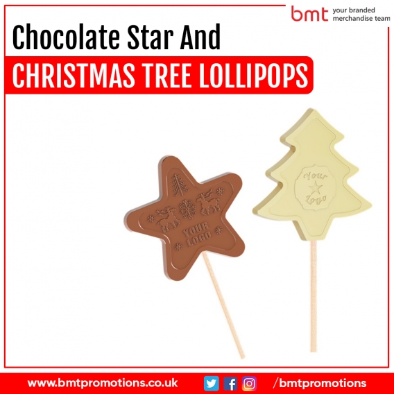 Chocolate star and Christmas tree lollipops We offer Chocolate star and Christmas tree lollipops with your business logo at reasonable prices. We are a leading promotional products manufacturer and supplier in the UK. Contact us today for any inquiry! https://bmtpromotions.co.uk/product/chocolate-star-and-christmas-tree-lollipops/