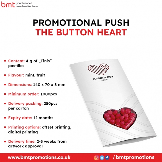 Made in the UK from 100% recycled plastic. The Standard Tyre Tread Gauge is a simple and practical device that checks whether your tyre tread depth is within the legal limit. This item comes complete with a keyring or ball chain fitting. Digitally printed in a one or full colour print. Available in White, Coloured Plastic and custom coloured (Pantone matched) at additional cost.800ml aluminium drinks bottle with a large fold out sipper built into the screw top lid. It comes with a carabiner clip. Conforms to articles in contact with food testing. https://bmtpromotions.co.uk/product/cherub-drinks-bottle/With its modern design, satin silver finish and funky clip design, the Viper Satin Ballpen is an appearling and versatile promotional pen. A black rubber grip provides soft compass while the silver-coloured barrel is perfect for spot colour printing. https://bmtpromotions.co.uk/product/viper-satin-ballpen/Our Sticky-Mate Notes are a real promotional favourite thanks to their great value for money and branding opportunities. They're available in a range of colours and sizes. Each pad contains 50 sheets of self-adhesive notes glued to a backing sheet. https://bmtpromotions.co.uk/product/sticky-note-2/Promotional Heart Candies Printed with Your Logo in the UK at the most attractive prices. Contact us now! https://bmtpromotions.co.uk/product/heart-candies/Find Promotional Push the Button Heart print with your brand logo in UK at reasonable prices from bmt promotions. Order now today! https://bmtpromotions.co.uk/product/push-the-button-heart/We are a leading supplier of small jute bags with your logo printed on them. We offer low-cost promotional branded little jute bags. https://bmtpromotions.co.uk/product/small-jute-bags/Three panel. Low profile. Matched colour sweatband. Fabric closure with hook and loop fasteners. Pre-curved bill has four rows of stitching. Oeko-Tex Standard 100. Washing InstructionsMachine wash warm. Inside out, with like colours. Only non-chlorine bleach. Tumble dry medium. Do not iron if decorated. Do not dry clean. https://bmtpromotions.co.uk/product/av703-anvil-low-profile-twill-visor/Shop for BB491 Beechfield Fingerless Gloves with your logo printed in the UK at the best prices. Please contact us right away! https://bmtpromotions.co.uk/product/bb491-beechfield-fingerless-gloves/100% latex balloons with up to five spot colours or CYMK printing (MOQ 3.000pcs). A bright, fun, bouncy balloon printed with a client's identity is the best low-cost promotional product in our opinion. All of our latex balloons may be filled with air or helium, and we provide a variety of attachments for this purpose, including valves, ribbon, and weights. To ensure that our clients' logo is precisely represented, we custom print latex balloons to their exact requirements and use the...Recycled Tetra Pak boxes are used to make an eco-friendly push-button ballpen. Because of the natural raw material utilised, the colour of the product may vary. https://bmtpromotions.co.uk/product/re-pen-push-ballpen/Robust iron stem with aluminium ribs, automatic function for faster opening and closing, attractive wooden handle with metal detailing and integrated push button, color-matched sleeve https://bmtpromotions.co.uk/product/autolux-1atx/Pencil made from recycled paper with a painted finish. Available in a range of colours with silver ferrule and pink eraser. Suitable for single colour printing only. https://bmtpromotions.co.uk/product/recycled-paper-pencil/