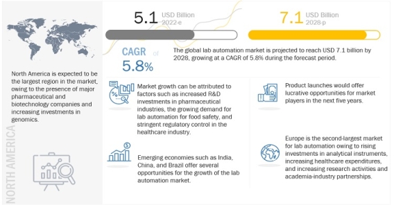 Lab Automation Industry Set for $7.1 Billion Valuation by 2028 The global lab automation market is projected to reach USD 7.1 billion by 2028 from USD 5.1 billion in 2022, growing at a CAGR of 5.8% during the forecast period. The growth of this market is primarily driven by the increasing investments and for the technological advancements. Robots can carry out repetitive operations like labeling by hand and handling microplates, while motorised pipettes and syringes can handle liquid...