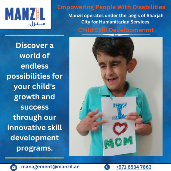 Unleash Potential. Empower Your Child for Child Skills Development. Manzil Center in Sharjah, UAE, offers a transformative approach to Child Skills Development for children with disabilities. Our tailored programs nurture each child in a supportive environment, unlocking their potential through personalized support and cutting-edge techniques. Overall, this advertisement effectively conveys Manzil Center's mission of creating a brighter future for all children, regardless of their abilities.