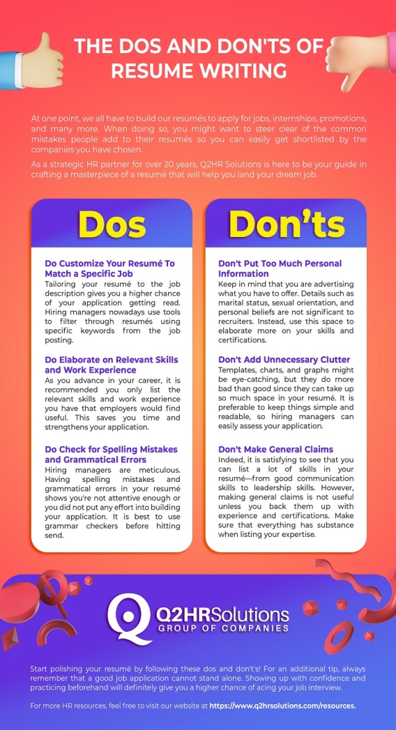 The Dos and Don'ts of Resume Writing At one point, we all have to build our resumes to apply for jobs, internships, promotions, and many more. When doing so, you might want to know strategies to increase your chances to get shortlisted by the companies you have chosen. Learn the Dos and Don'ts of Resume Writing by visiting our website. https://www.q2hrsolutions.com/