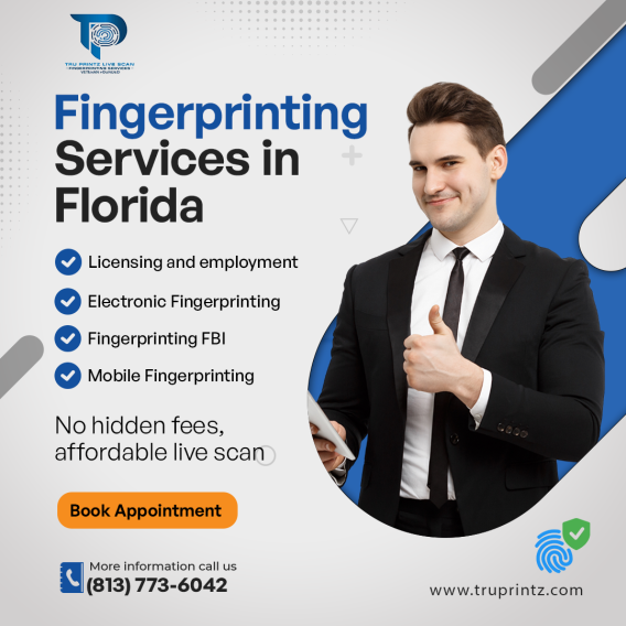 Need fingerprinting for a new job, background check, or adoption? Tru Printz has your back! We're Tampa's go-to for convenient, professional live scan services. We are a veteran-founded fingerprinting services provider dedicated to providing our community with accurate, efficient, and affordable fingerprinting services. We are FDLE-approved, so you can be sure your fingerprints will be scanned and submitted according to the highest standards. We also offer a convenient online scheduling...